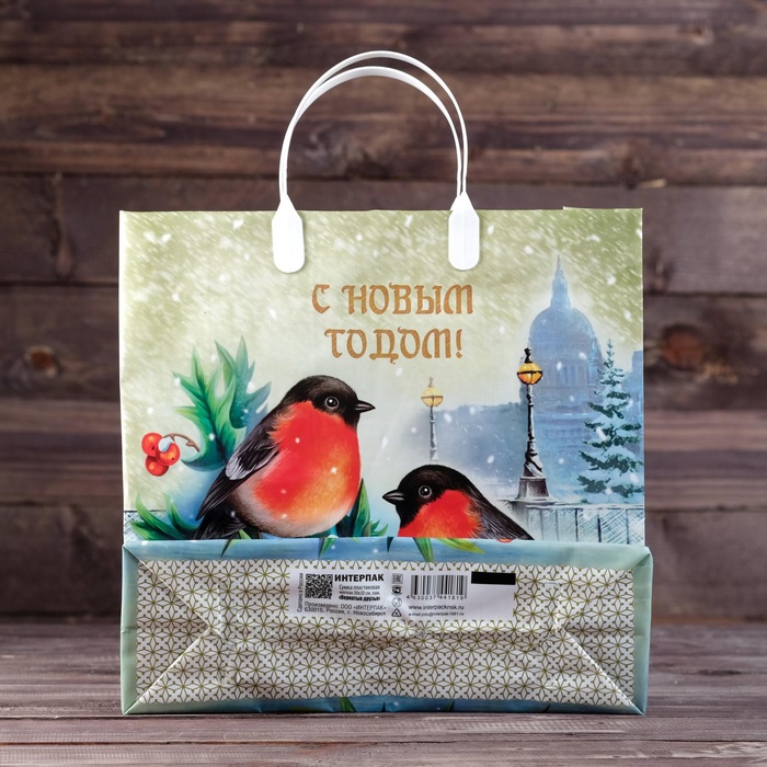 - Сезонный дизайн: Тематический рисунок с зимними птицами не требует дополнительного оформления. Пластиковые ручки удобны для транспортировки.