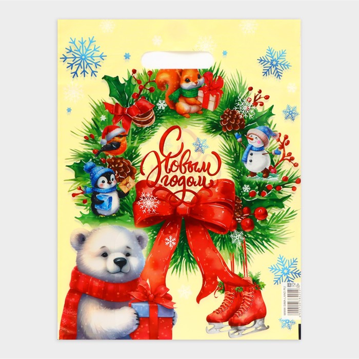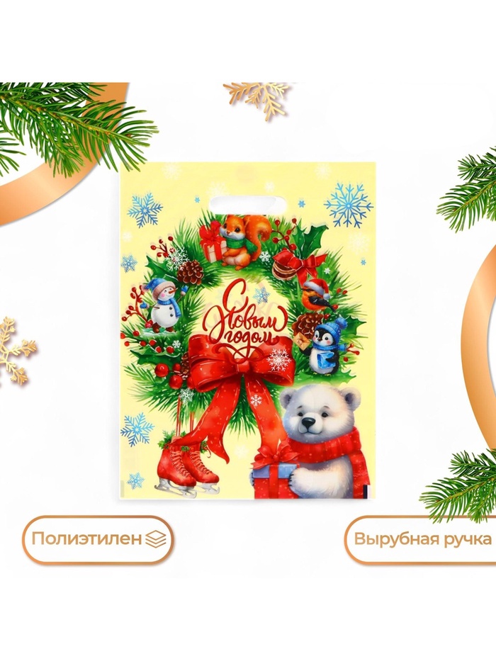 Пакет подарочный новогодний «Рождественский венок», полиэтиленовый с вырубной ручкой, 30×40 см
