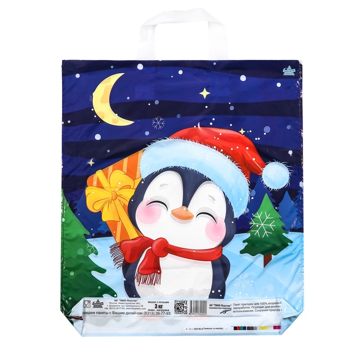 Создайте праздничное настроение с яркой упаковкой! Новогодний подарочный пакет «Сюрприз от пингвина» — это прочная и вместительная упаковка для подарков с удобной петлевой ручкой. Яркий дизайн и надежный материал сделают любой презент еще более приятным.