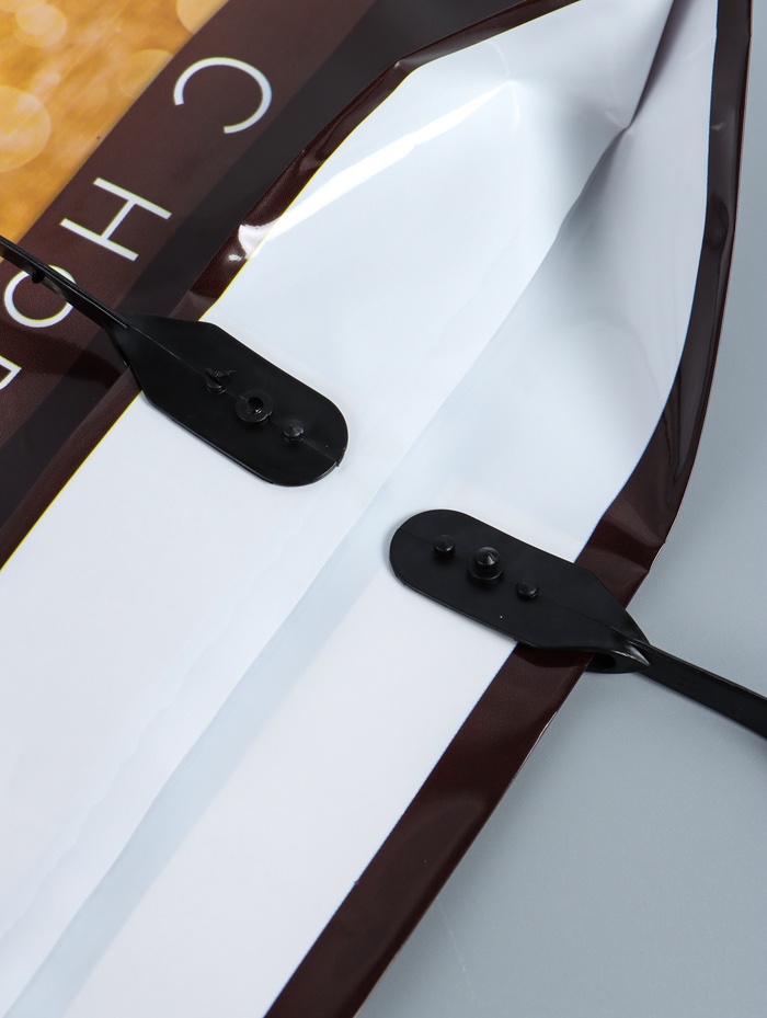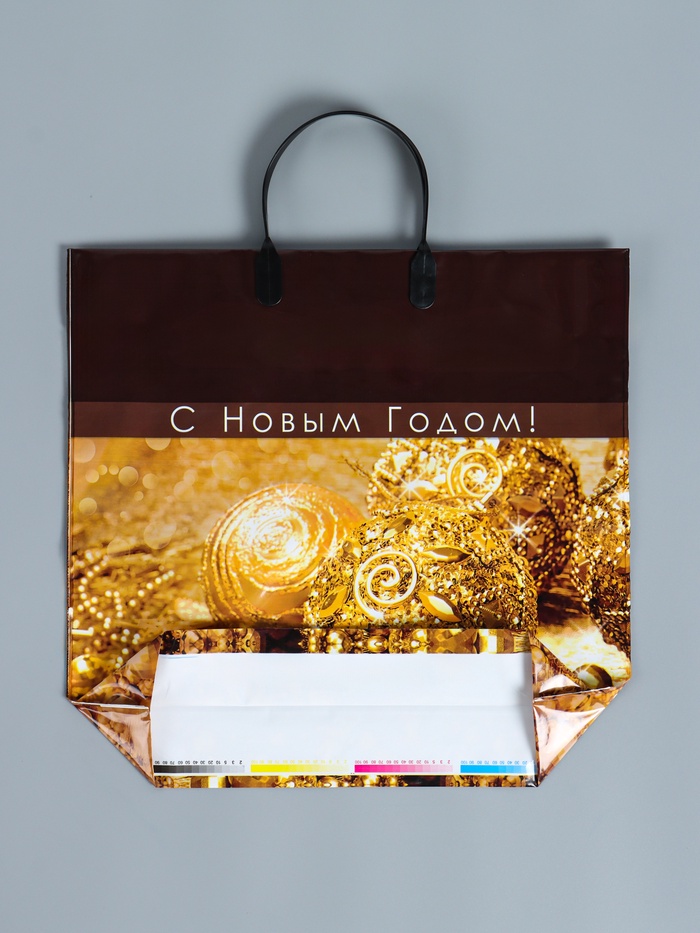 - Прочная пластиковая ручка: Удобно лежит в руке, не врезается даже при переноске тяжелых подарков. Надежно закреплена по всей длине пакета.