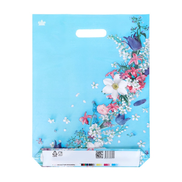 - Нежный цветочный дизайн: Изящный букет садовых цветов на светлом фоне выглядит свежо и нарядно. Такой пакет особенно уместен для подарков на 8 Марта, дни рождения или в качестве дополнения к живому букету.