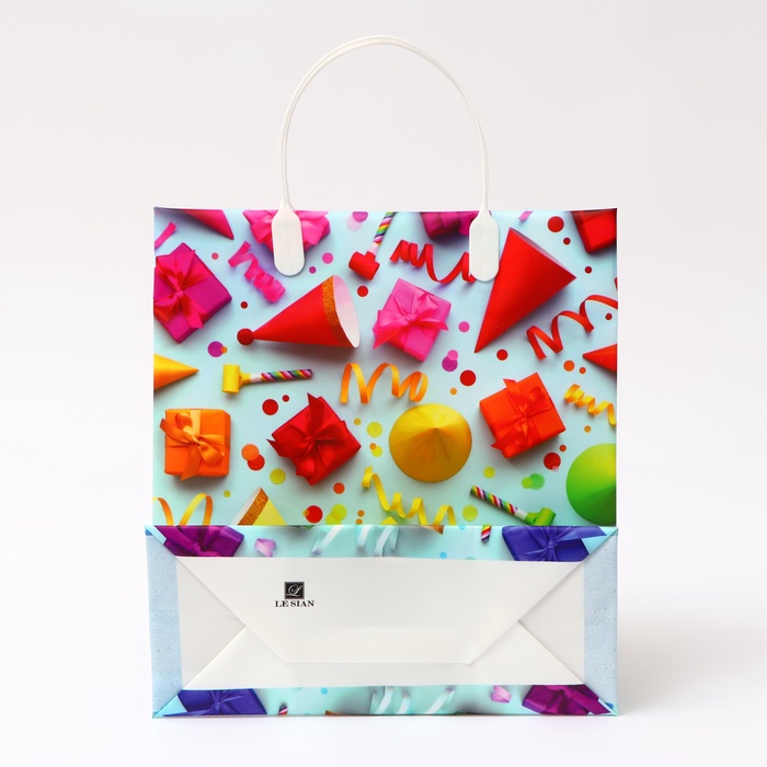 Эргономичные ручки обеспечивают комфортное ношение, а устойчивость к влаге и внешним воздействиям гарантирует надежную защиту содержимого. Пакет может использоваться как для личных нужд, так и в коммерческих целях, например, в магазинах и на предприятиях, заботящихся о качестве упаковки. Благодаря эстетичному внешнему виду и практичности, он становится отличным выбором для упаковки товаров на вынос, подарков или повседневных покупок.