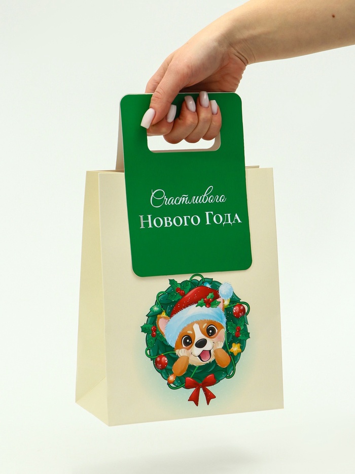 Пакет подарочный с вырубной ручкой «Новогодний корги» 18×23×9 см, зеленый