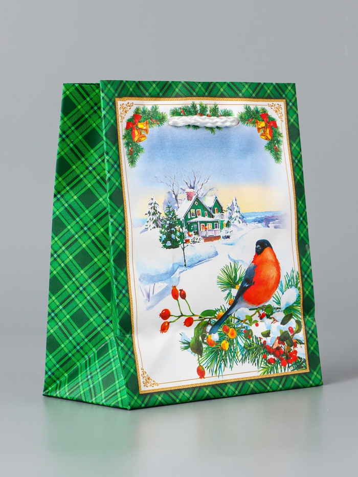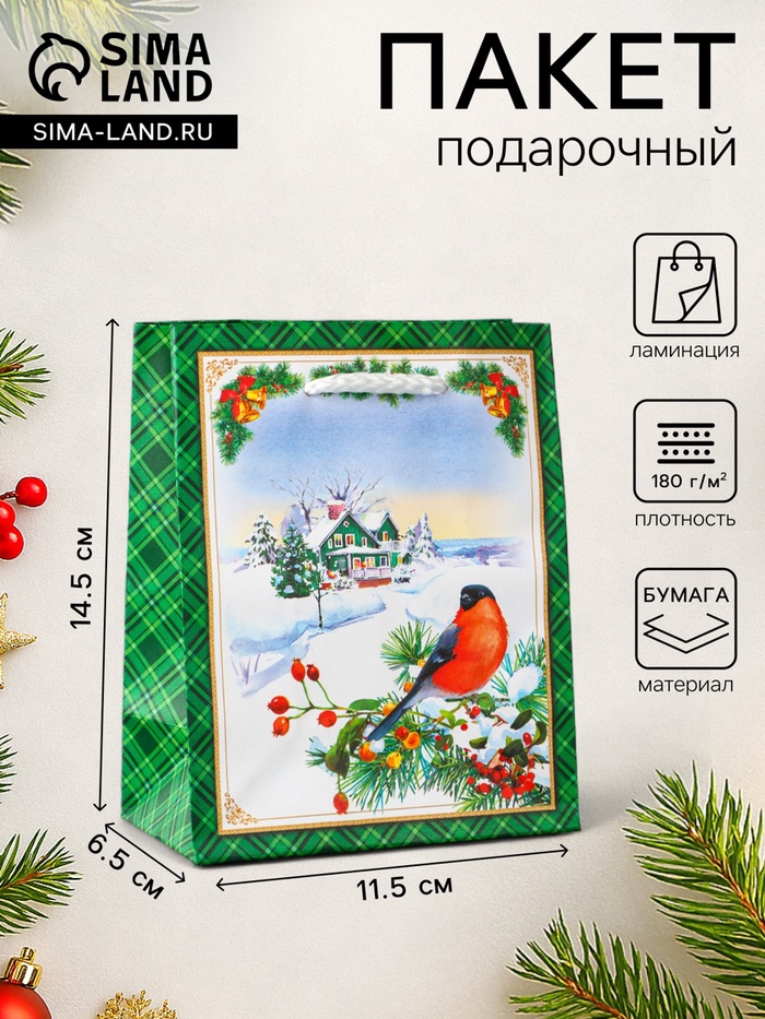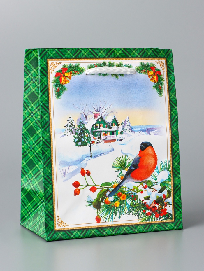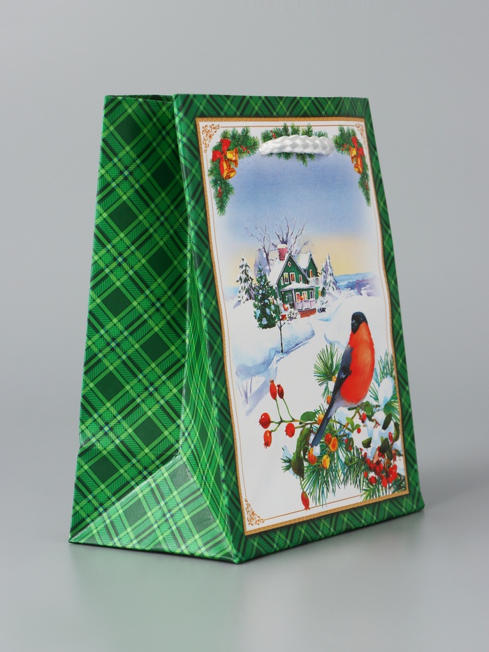 Новогодний подарочный пакет с ярким, красочным рисунком создаст праздничное настроение.