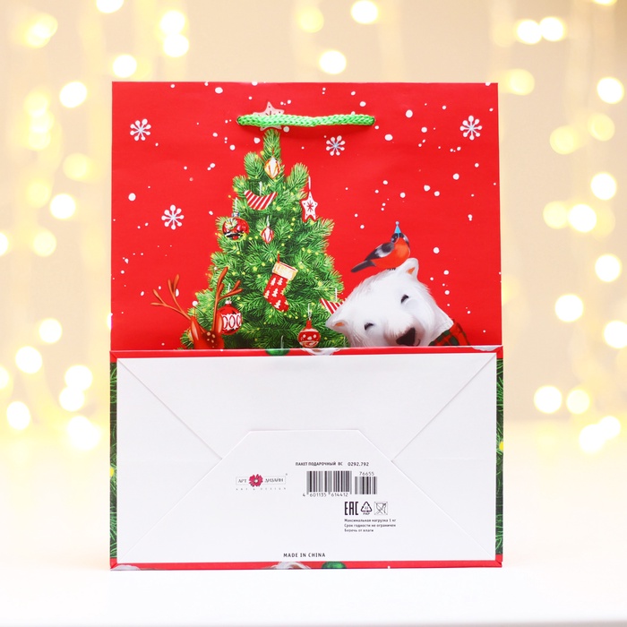 Пакет подарочный новогодний изготовлен из прочного и качественного материала, включая картон, текстиль и высококачественную бумагу.