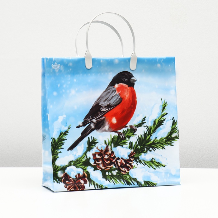 Новогодний подарочный пакет с ярким, красочным рисунком создаст праздничное настроение.