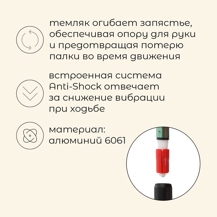 - Темляк огибает запястье, обеспечивая опору для руки и предотвращая потерю палки во время движения. Конструкция петли позволяет отрегулировать необходимую длину.