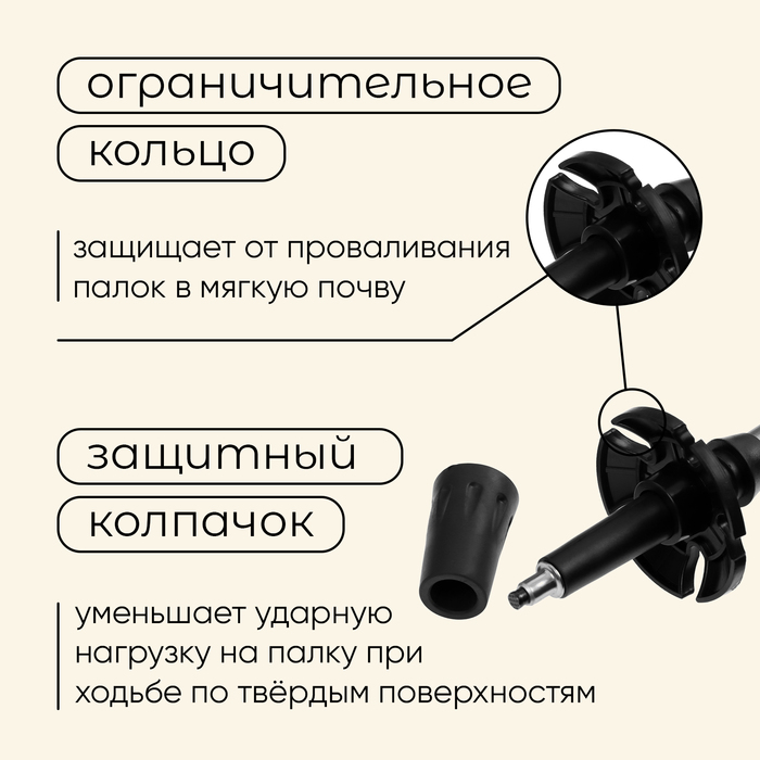 - Защитный колпачок уменьшает ударную нагрузку на палку при ходьбе по твёрдым поверхностям, предотвращает износ металлических наконечников и защищает рюкзак или обивку автомобиля от повреждений при транспортировке.