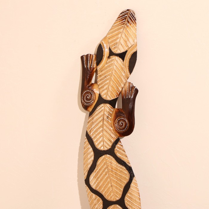 Не каждый осмелится разместить такое панно ручной работы в своем интерьере. Ведь порой кажется, что это настоящая живая рептилия. Искусные индонезийские мастера изобразили всё настолько детализировано четко, что хочется прикоснуться к панно дерево "Геккон" 100х14х1 см и ощутить тонкие линии изгибов этой «ящерицы счастья».