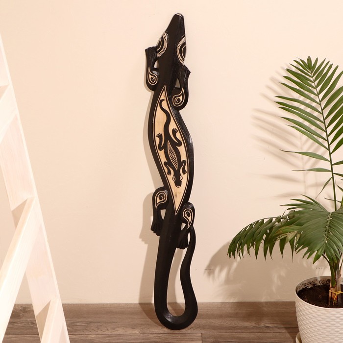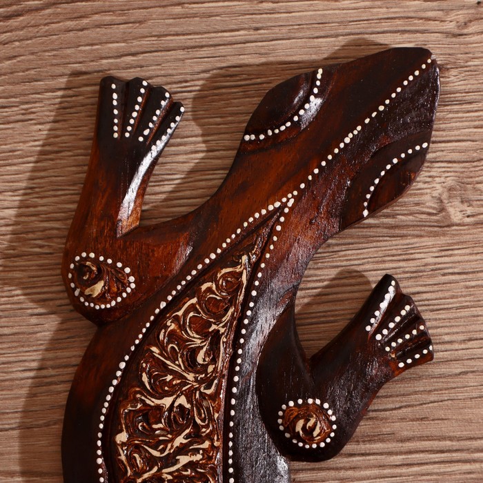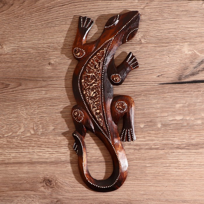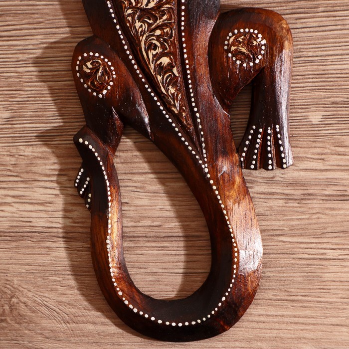 Не каждый осмелится разместить такое панно ручной работы в своем интерьере. Ведь порой кажется, что это настоящая живая рептилия. Искусные индонезийские мастера изобразили всё настолько детализировано четко, что хочется прикоснуться к панно дерево "Геккон" 31х11х1 см и ощутить тонкие линии изгибов этой «ящерицы счастья».