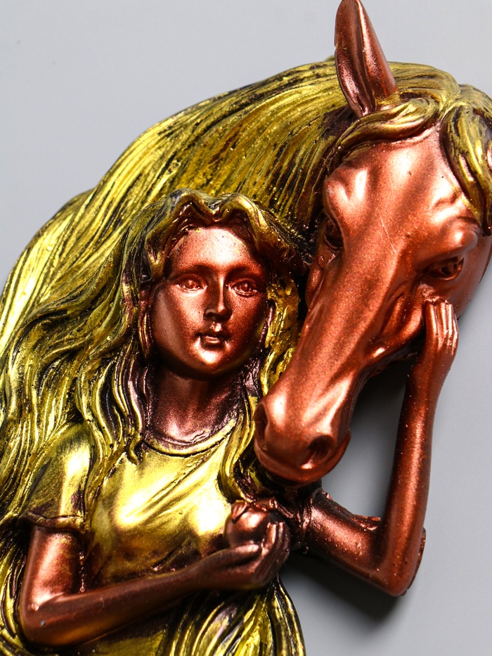 Это настенное панно с девушкой и лошадью создаёт в доме особенную атмосферу. Композиция, застывшая в полистоуне, передаёт тонкую связь между человеком и животным, добавляя интерьеру глубины и душевного тепла.
