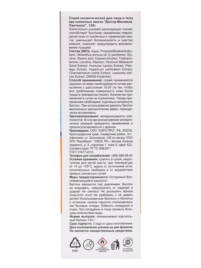Пантенол спрей для лица и тела «Доктор Мясников», при солнечных ожогах, 130 г