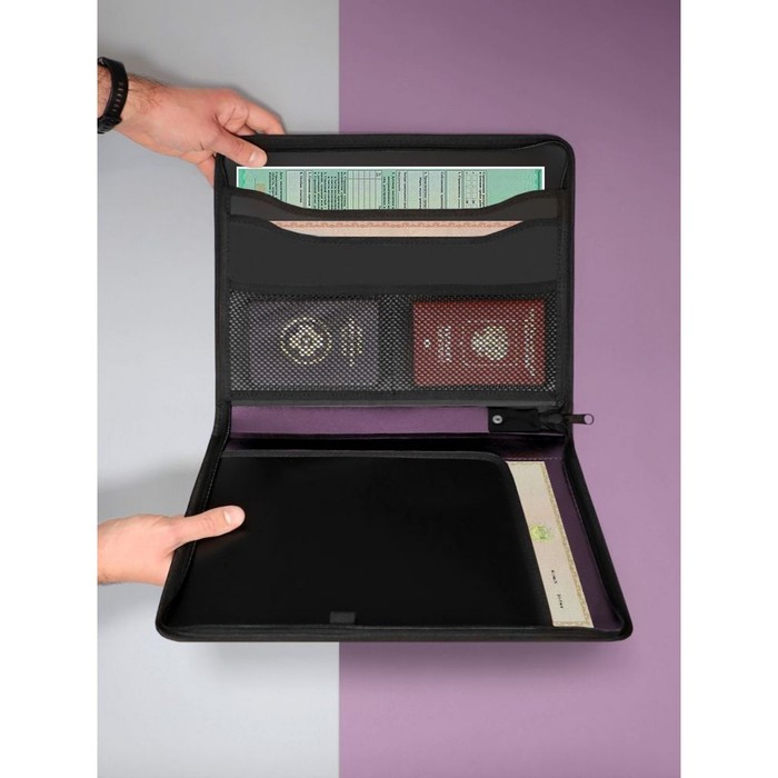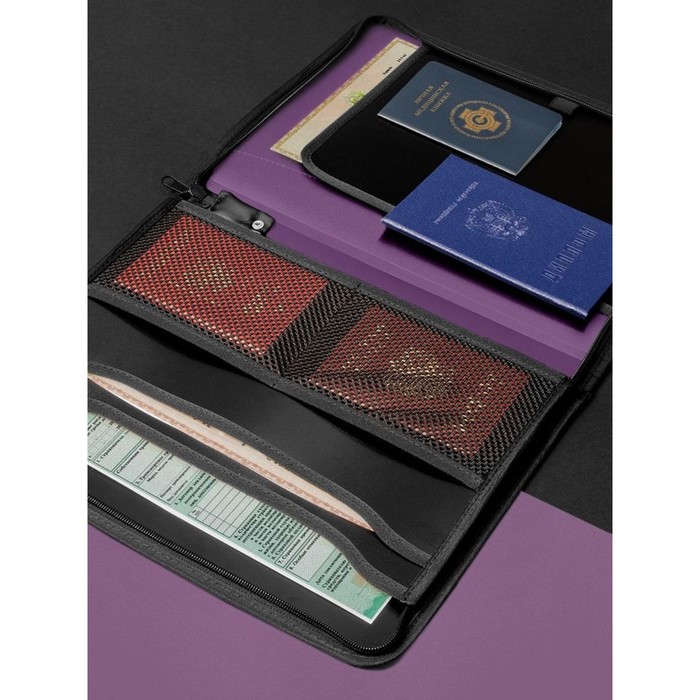 Папка на молнии Calligrata предназначена для переноски документов, а также их хранения. Незаменима в работе и учебе, в командировках, деловых поездках, путешествиях. Изготовлена из прочного черного полипропилена толщиной 0,9 мм с фактурой "бисер". Формат А4 (350х282 мм). Имеет два внутренних отделения и четыре кармана. Надежный замок-молния защищает документы от механических повреждений, а также пыли и влаги. Цвет папки -сиреневый металлик. Важные документы и ценные бумаги всегда требуют повышенного внимания и деликатного обращения. Их безопасность и опрятный внешний вид обеспечит папка Calligrata. Организовать деятельность сотрудников, нацеленную на высокий результат, помогут товары нашего интернет-магазина!