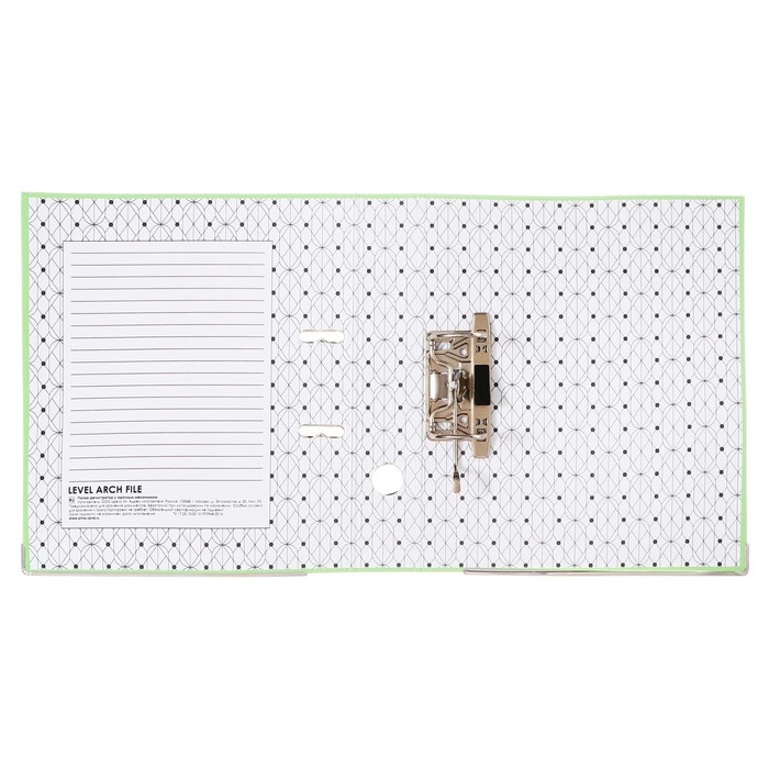 Папка-регистратор с арочным механизмом изготовлена из плотного картона, с внешней стороны заламинированного полипропиленовой пленкой (РР) с текстурой "лен", внутри оклеена бумагой с алфавитно-цифровым полем для классификации на левой стороне.