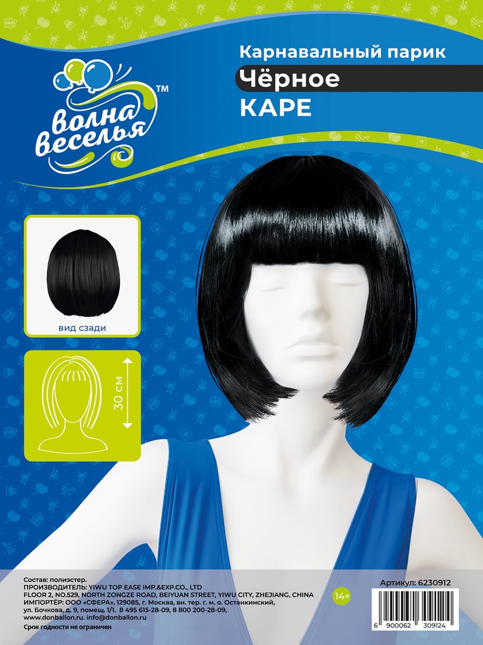 Парик карнавальный «Каре» черный, 1 шт. 110 г