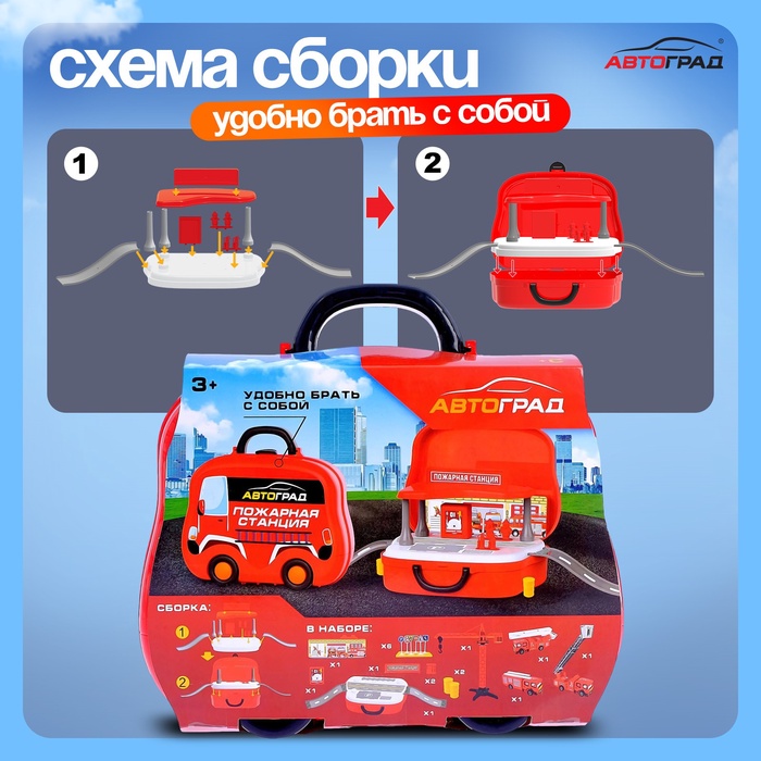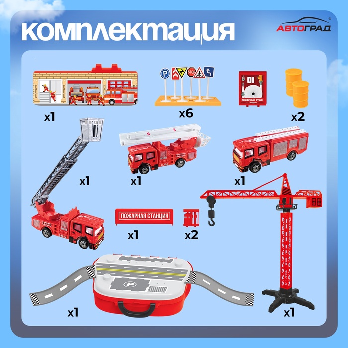 - Комплектация парковки: 3 машинки, кран, аксессуары и наклейки, что позволит создать полноценную пожарную станцию в домашних условиях.
