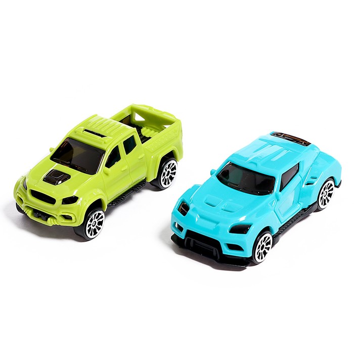 - Две машинки в комплекте: пикап и гоночный автомобиль.