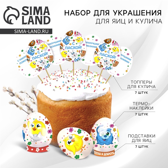 С помощью данного набора вы сможете украсить яйца и куличи к светлому празднику Пасхи. В комплект входит 7 термонаклеек, 7 топперов для кулича и 7 подставок для яиц.