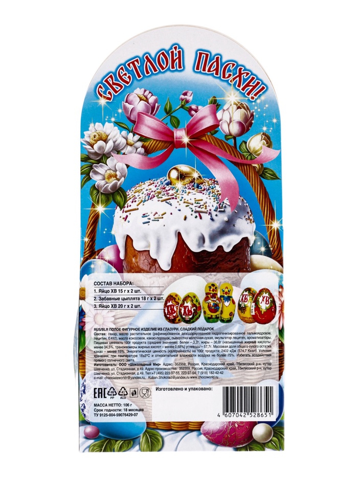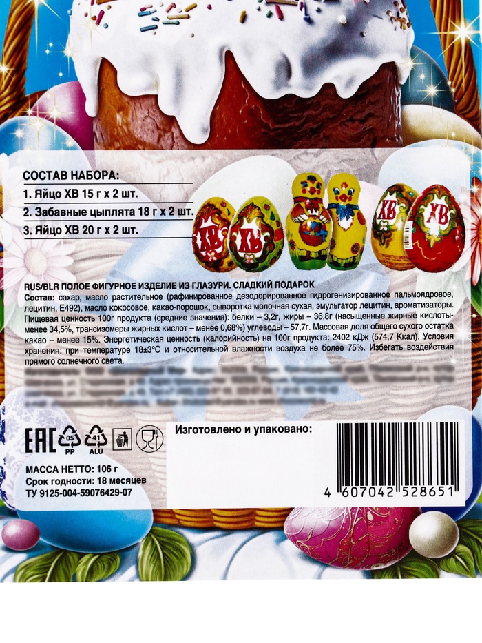 - Вес нетто всех кондитерских изделий — 106 грамм.
