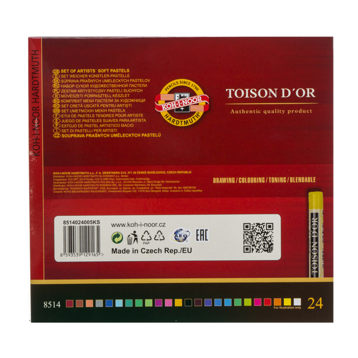 Сухая пастель Toison d'or extra soft изготавливается из высококачественных пигментов с минимальным использованием связующего элемента. Высокая концентрация пигмента способствует легкому распределению тона по светлым и темным поверхностям, а тонкий помол пигмента дает неограниченные возможности в создании фона и новых оттенков цвета путем смешивания.