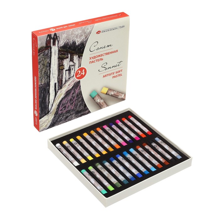 Художественная пастель "Сонет" предназначена для живописи и декоративных работ. Произведена по особой технологии с применением тонкодисперсных пигментов, благодаря чему пастельный штрих мягкий, бархатистый, легко ложится и растушевывается на основе. Чистые интенсивные цвета пастели отлично смешиваются между собой, позволяют добиваться плавных переходов и градиентов. Кроме традиционного применения, ее можно сочетать с другими материалами (чернилами, гуашью, акварелью, акрилом, карандашами), а также размывать водой или рисовать по мокрой поверхности. Представлена в наборах по 12, 24, 36 и 48 цветов, а также двумя тематическими наборами "Графика" и "Земляные тона".