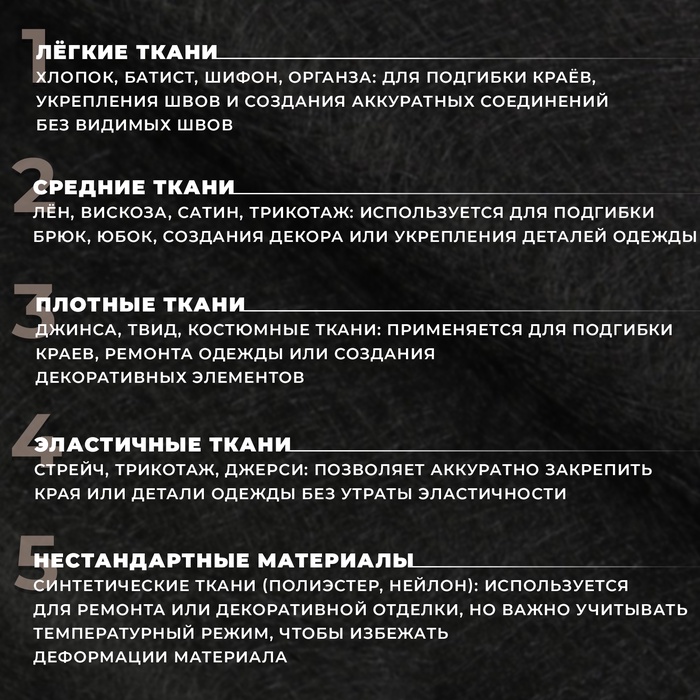 Паутинка подходит для мелкого ремонта одежды и подгиба низа изделий. Чтобы приклеить её, необходимо расположить изделие между двух тканей и проутюжить с изнаночной стороны. Главное, чтобы горячая поверхность не соприкасалась с паутинкой напрямую, иначе она оставит на одежде след.