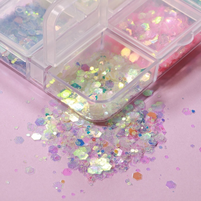 Чтобы сделать его ещё привлекательнее и ярче - Вам помогут разноцветные пайетки, которые светятся в темноте. Просты в использовании и универсальны в применении. Можно использовать не только для маникюра, но и для поделок, декора. Пайетки находятся в органайзере, что не позволит им высыпаться.