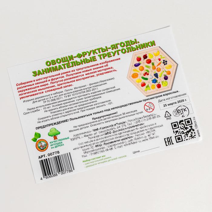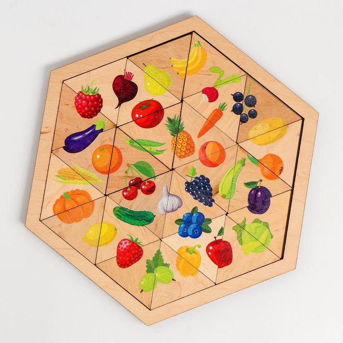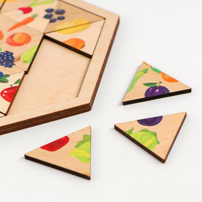 Пазл деревянный «Овощи, фрукты, ягоды. Занимательные треугольники» — изучение основных фруктов, овощей и ягод при помощи пазла, одно из самых интересных и полезных занятий для малыша в первые годы его жизни.