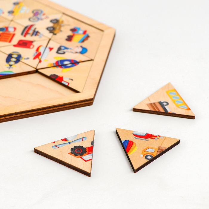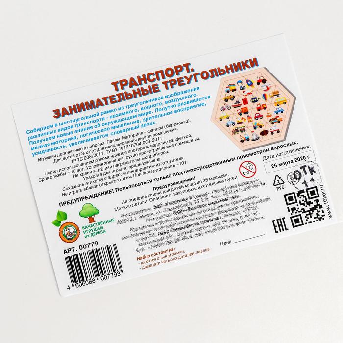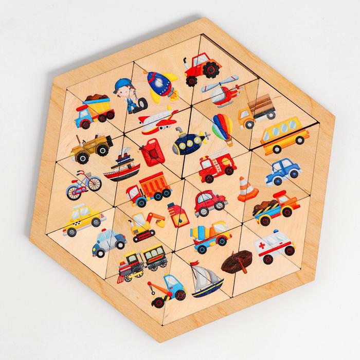 Пазл деревянный «Транспорт. Занимательные треугольники» — изучение различного вида транспорта, а также относящимися к ним предметами и ситуациями, одно из самых интересных и полезных занятий для малыша в первые годы его жизни.