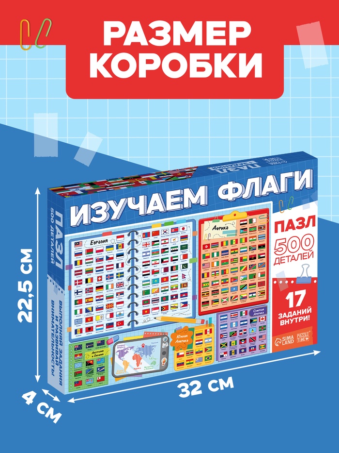«Флаги мира» — это пазл для тех, кто смотрит за горизонт. Собирая 500 деталей, вы не просто складываете карту — вы путешествуете: от ярких цветов Африки до строгих полос Скандинавии, от символики Азии до узоров Латинской Америки. Каждый флаг — это история, и теперь вы можете её прочитать без слов.