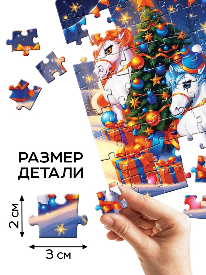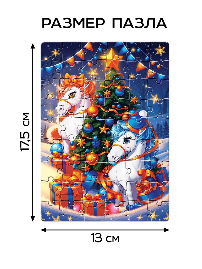 Пазл «Подарки от лошадок» — это увлекательная головоломка из 54 элементов, которая перенесёт ребёнка в мир животных и новогодней магии. Этот классический пазл прямоугольной формы создан для детей от 3 лет и станет прекрасным подарком на зимние праздники или дополнением к семейному досугу. Собирая пазл, ребёнок создаёт яркую картину с милыми лошадками, которые словно принесли с собой немного праздничного волшебства.