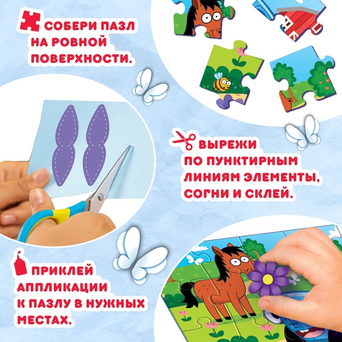 - Приятный бонус, аппликации можно создавать прям на пазле, ведь все необходимое есть в наборе.