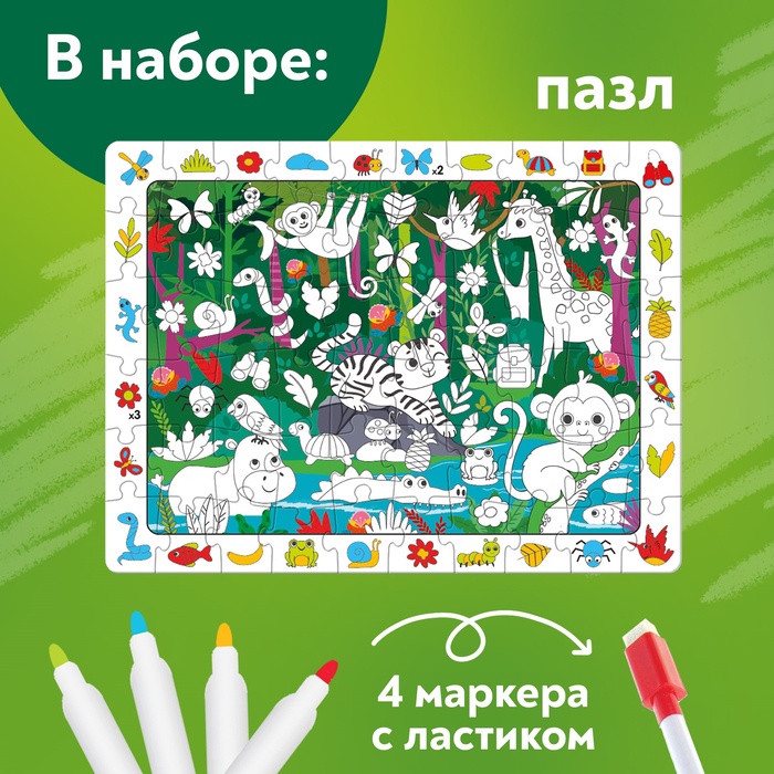 Пазл «Собери, найди, раскрась» — это не просто пазл, а неограниченное поле для творчества! Ведь малышу предстоит собрать головоломку, отыскать спрятанные предметы и раскрасить детали на свой вкус.