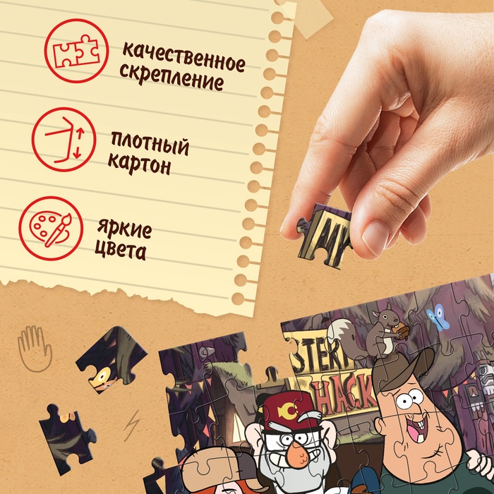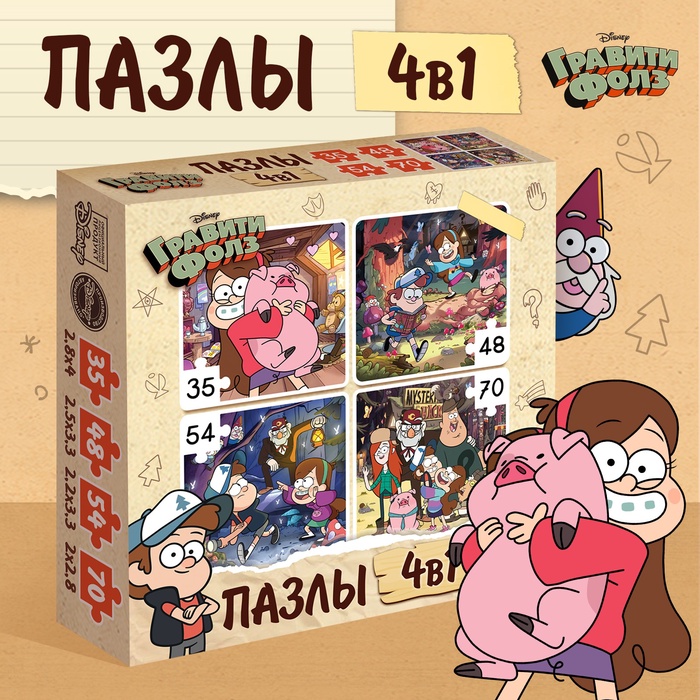 Пазлы 4 в 1 «Секреты Гравити Фолз» — это набор из четырёх ярких головоломок, которые знакомят детей с временами года и любимыми персонажами мультфильма. Каждый пазл состоит из разного количества элементов, что делает их идеальными для малышей от 3 лет. Яркие изображения и удобный размер деталей помогают развивать мелкую моторику, внимание и логическое мышление.