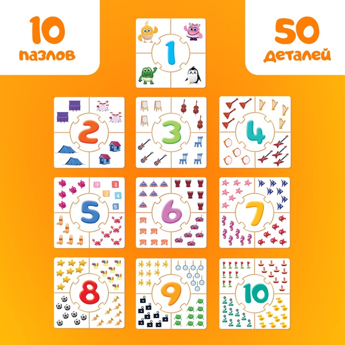 Пазлы-лото «Учим числа с Цыпой» — это увлекательная игра для детей от 3 лет, которая сочетает обучение цифрам и счёту с любимыми персонажами из мультфильма. Набор включает 50 элементов, из которых можно собрать 10 пазлов: центральная часть с цифрой и четыре детали с изображениями друзей Цыпы. Ребёнку нужно посчитать количество персонажей и подобрать их к соответствующей цифре.