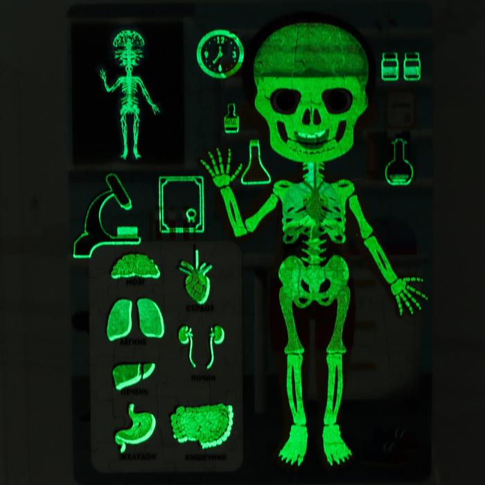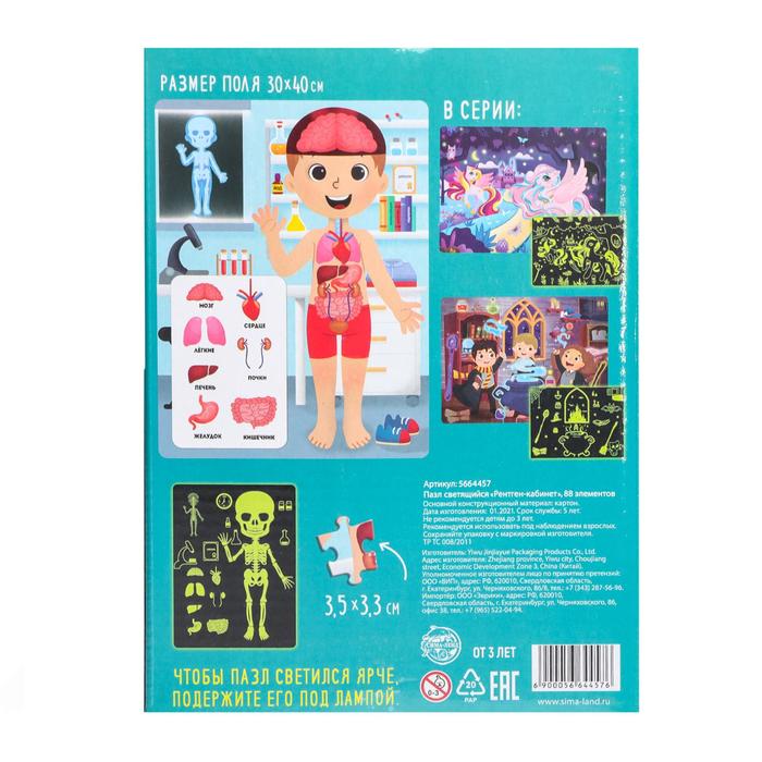 Cветящийся пазл «Рентген-кабинет» — это занимательная развивающая игра в новом формате. Достаточно выключить свет в комнате, и вы увидите, как собранная картинка благодаря особой краске начнёт светиться в темноте.