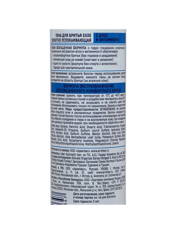 В состав пены для бритья EXXE SENSETIVE входит максимум натуральных компонентов, которые не сушат кожу, питают и увлажняют её, обеспечивая плавное и легкое бритье. Аллантоин подтягивает кожу, заживляет порезы, снимает раздражение, витамин Е защищает от токсинов. Повышенное пенообразование обеспечивает длительное время использования. Имеет ненавязчивый и приятный мужской аромат.