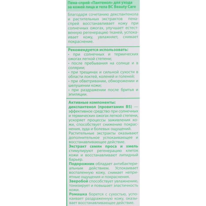 Пена-спрей для лица и тела Пантенол ВС - оказывает быструю помощь при солнечных и термических ожогах, улучшает естественную регенерацию тканей. Новая формула с маслом облепихи и экстрактом череды бережно ухаживает за кожей, успокаивает, увлажняет кожу и снимает покраснение.