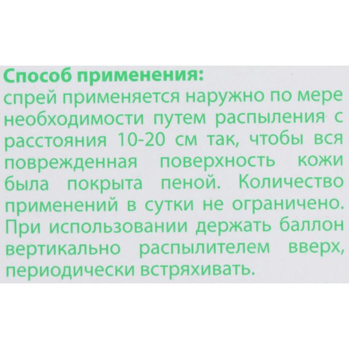 Способ применения: применяется наружно по мере необходимости путем распыления с расстояния 10-20 см так, чтобы вся поврежденная поверхность кожи была покрыта пеной. Количество применений в сутки не ограничено. Перед применением необходимо тщательно встряхнуть баллон.