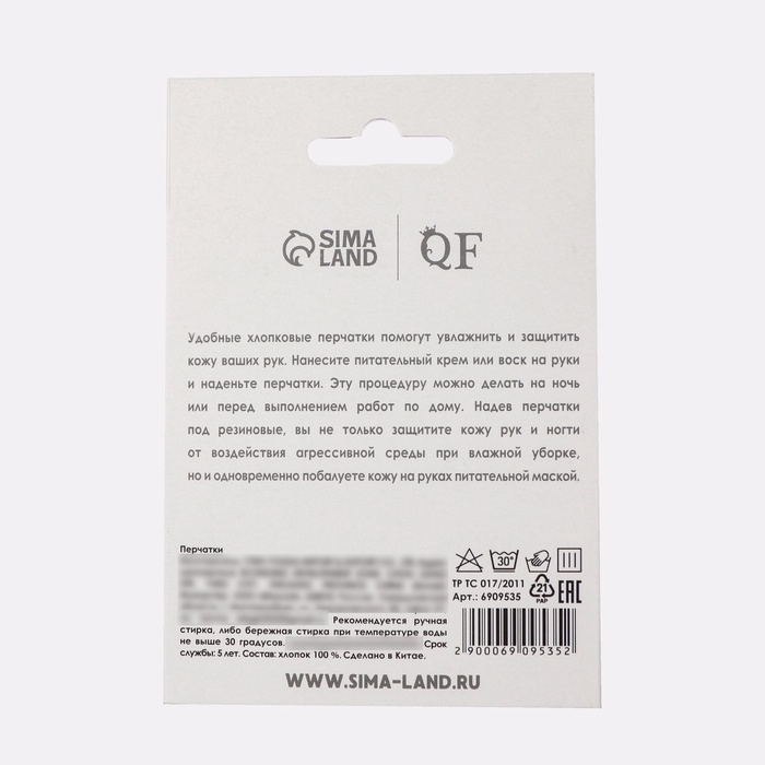 Перчатки изготовлены из натурального хлопка. Они комфортно сидят на руках и пропускают воздух. Надевайте перчатки после нанесения масок, кремов и любых других уходовых средств, чтобы усилить их косметические свойства. Перчатки предназначены для работы с коллекционными предметами, стеклом и для защиты от любых внешних воздействий. Можно использовать несколько раз, подходят для ручной и машинной стирки.