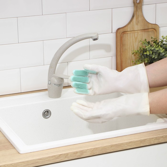 - Мытье посуды: щетки на одной из перчаток помогут легко справиться с загрязнениями без дополнительных инструментов.