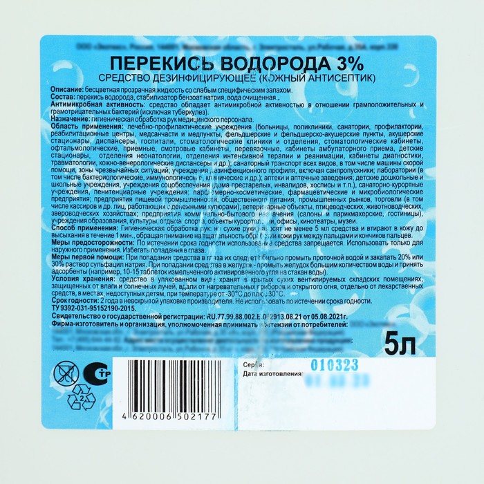 Средство «Перекись водорода 3 %», представляет собой готовый к применению антисептик в виде бесцветной прозрачной жидкости без запаха. Обладает бактерицидной, туберкулоцидной, вирулицидной, фунгицидной и спороцидной активностью. Антимикробные свойства средства сохраняются в присутствии моющих средств. Средство в качестве действующих веществ содержит перекись водорода в концентрации от 2,7 до 3,3 %, стабилизатора натрия бензоата и воду.