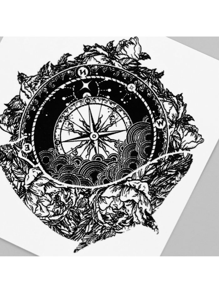 Переводная тату на тело чёрная «Кит и компас», 8×7.5 см