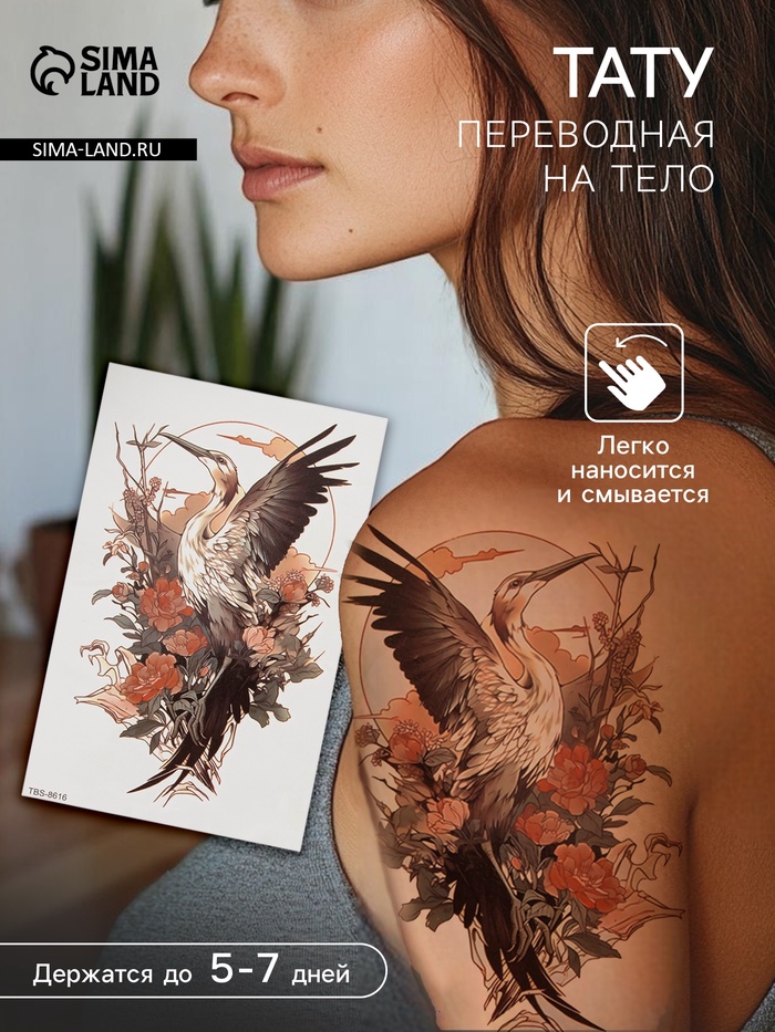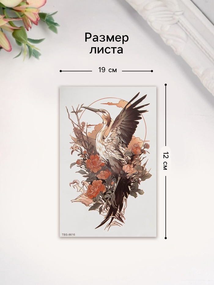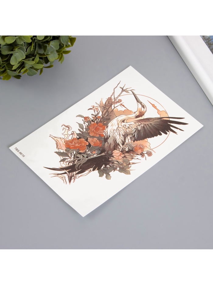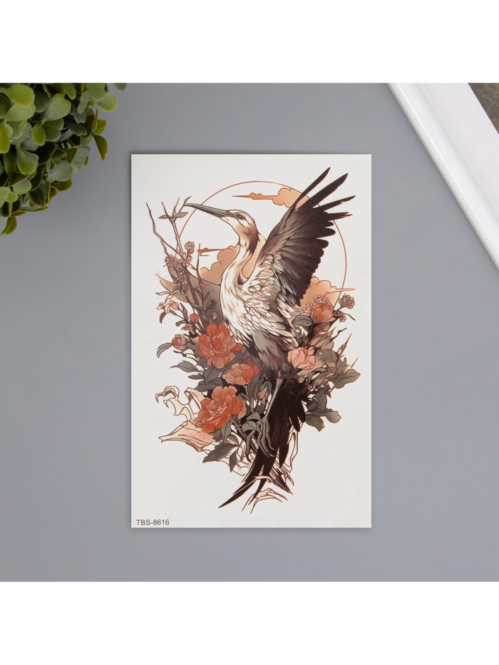 Разноцветное исполнение рисунка с изображением аиста среди цветов создаёт ощущение весеннего пробуждения и радости. Будь то повседневный стиль или особое событие, такая татуировка органично дополнит любой образ. Универсальное место приклеивания позволяет разместить её на любом участке тела, делая её подходящей как для женщин, так и для мужчин.