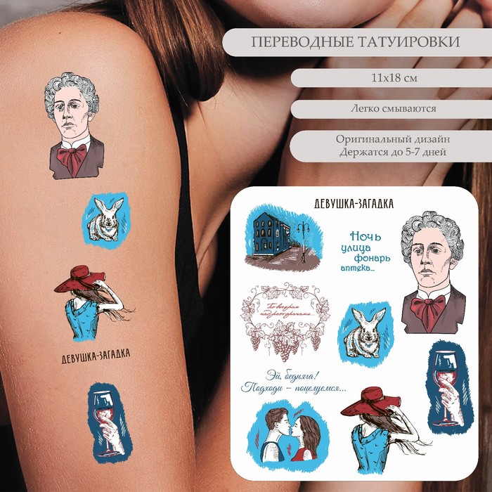 Переводные татуировки, вдохновленные строками Александра Блока «Ночь, улица, фонарь, аптека», переносят вас в мир поэзии и символизма. Эти яркие наклейки на листе размером 18×11 см сочетают темы городской жизни, любви, природы и напитков, создавая уникальный образ на коже. Идеально подходят для тех, кто ценит креативность и хочет выразить себя через искусство.