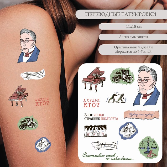 Добавьте яркий акцент в свой образ с переводными тату, вдохновлёнными классикой русской литературы. Эта цветная наклейка с узнаваемой цитатой станет стильным временным украшением, подчеркивающим вашу индивидуальность и любовь к искусству слова.