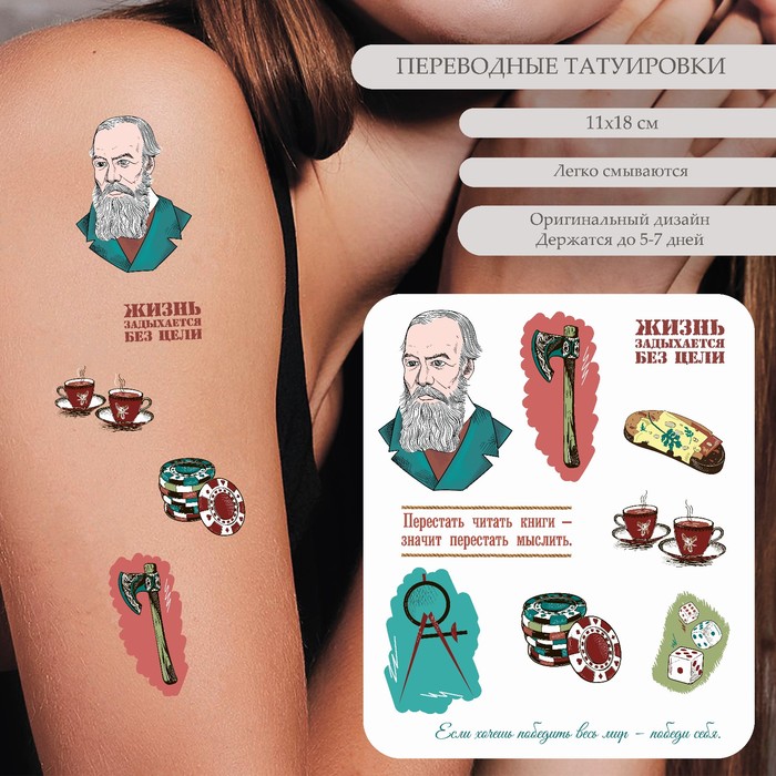 Временная татуировка с цитатой классика — способ носить философскую мысль как часть образа. Размер 18×11 см даёт достаточно места для выразительного текста, а пластиковая основа сохраняет чёткость линий.