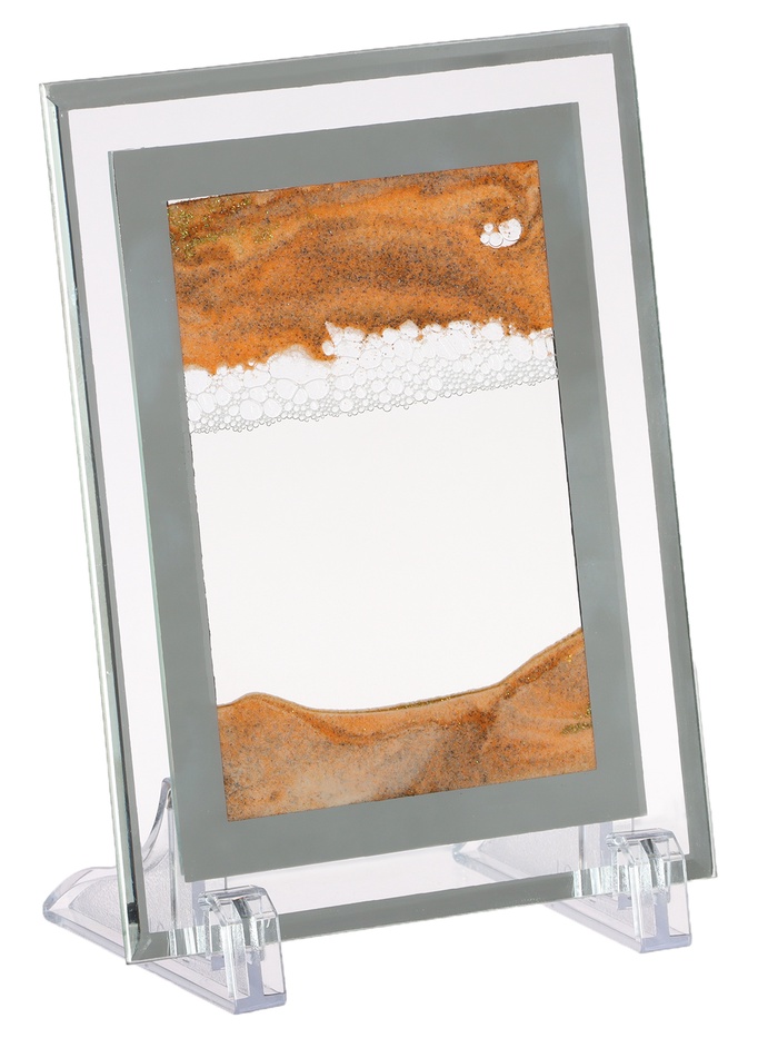 Вы воздействуете одним прикосновением, когда рамка переворачивается, песок начинает произвольно струиться вниз, огибая пузырьки жидкости, образуя удивительной красоты пейзажи. Наблюдение за этим процессом позволяет человеку расслабиться, отдохнуть, успокоить нервы.