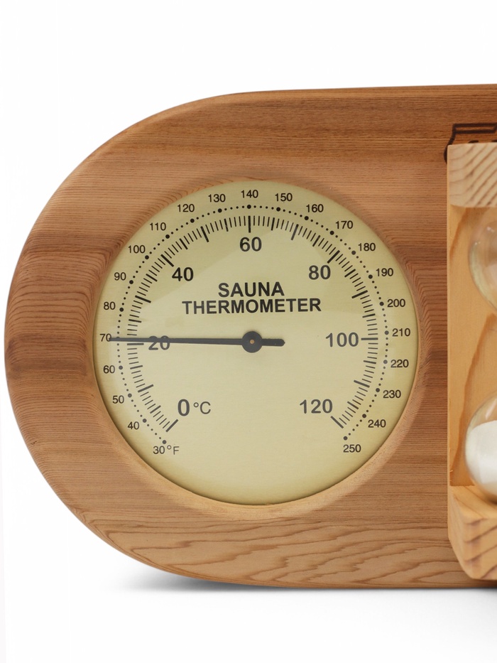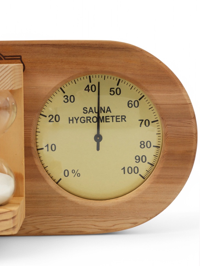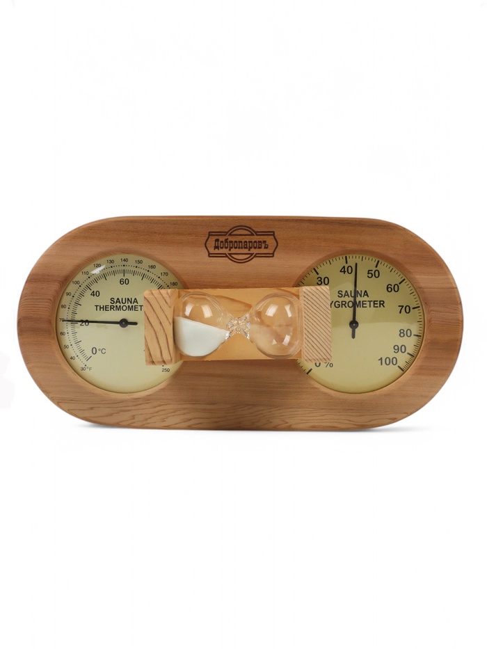 - Три параметра для идеального парения: в одном приборе собраны три шкалы. Термометр показывает температуру, гигрометр — уровень влажности, а песочные часы отсчитывают время пребывания в парной. Это даёт полную картину микроклимата.