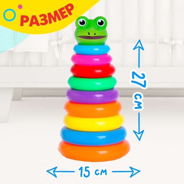 Пирамидка "Лягушка", 9 колец – это одна из самых первых игрушек, которая дает ребенку представление о размерах и цветах предметов. Малыш сравнивает между собой детали и учится логически мыслить. Пирамида состоит из 9-ти колец и игрушки-наконечника, завершающей собирательный процесс. Все предметы изготовлены из безопасного нетоксичного пластика.